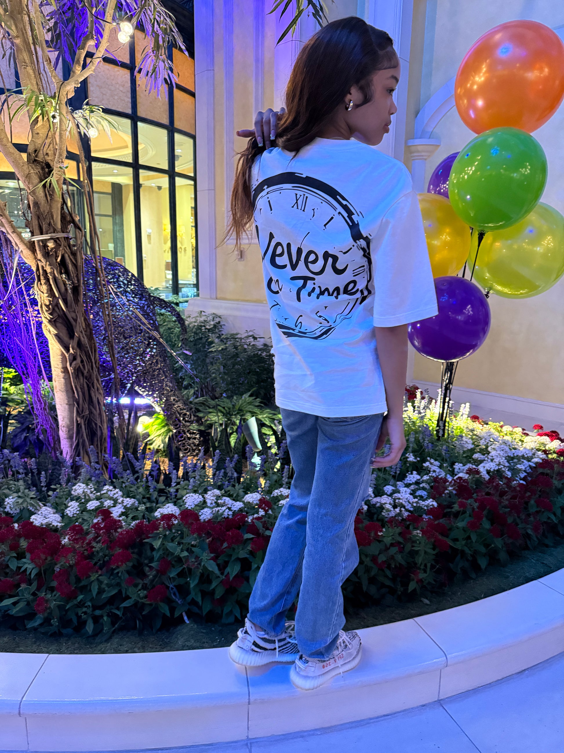 Crafted from premium 300 GSM cotton, this tee delivers heavyweight comfort with a modern streetwear edge. Featuring a bold, hand-style “TIME” graphic stitched across the chest and a signature NeverOnTime woven patch near the hem, this shirt speaks volumes without saying a word. The boxy, oversized fit offers a relaxed silhouette that’s perfect for layering or standing out solo.